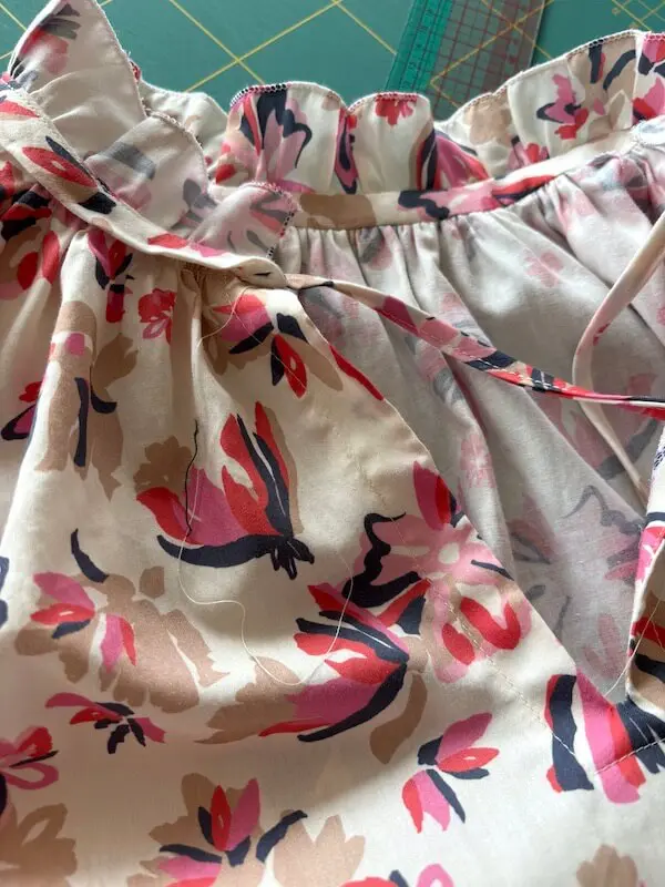 La blouse Pima comporte beaucoup de fronces, notamment au niveau de l’encolure. Si vous débutez avec cette technique, retrouvez la méthode des deux fils de fronces dans cet article dédié.