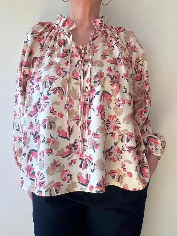 La blouse Pima reste un patron intéressant pour travailler les fronces, le col volanté et la parementure dans une pièce portable au quotidien.