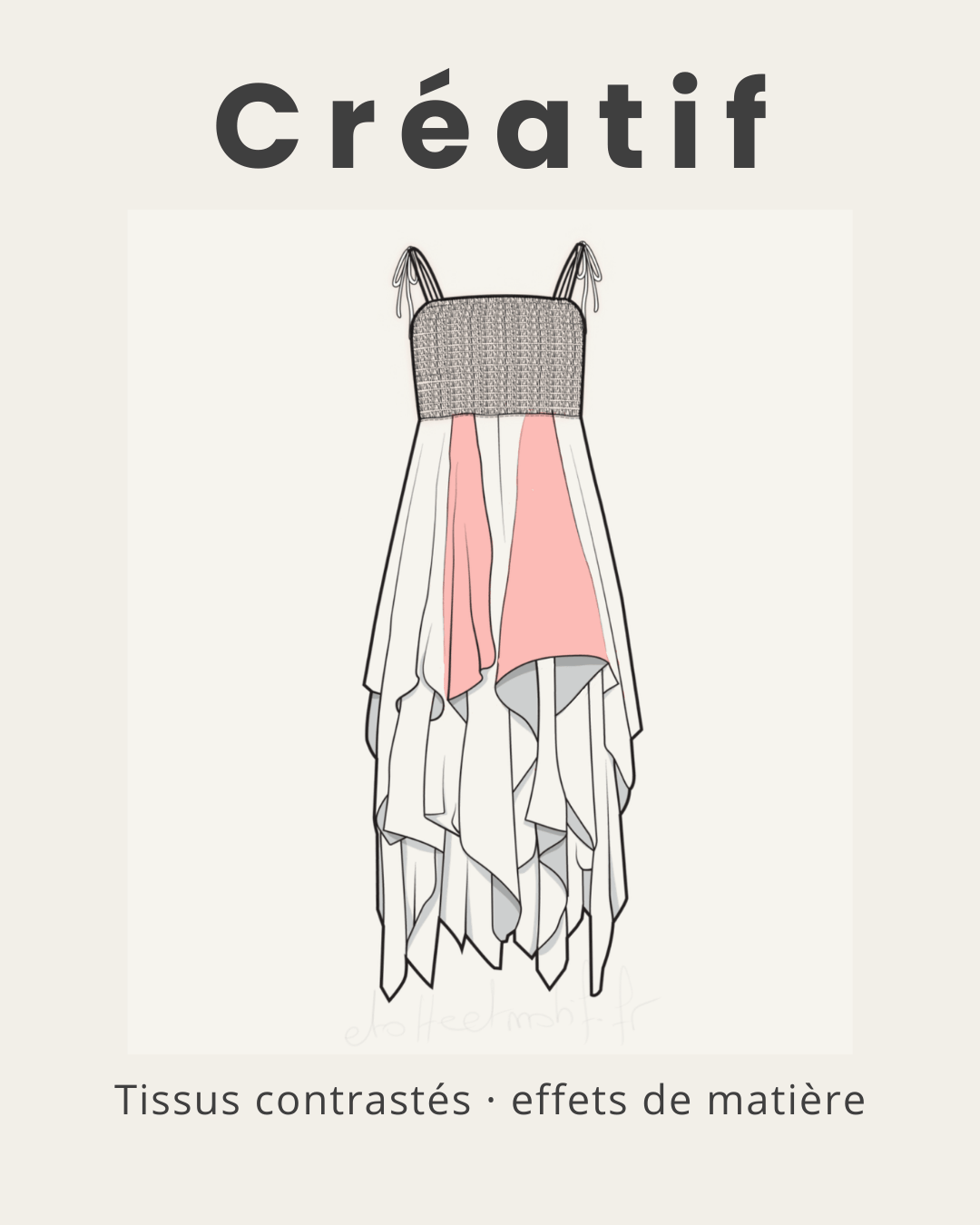Le dessin technique du patron aide aussi à visualiser le rendu final et à imaginer le comportement du tissu. Lorsqu’un modèle comporte de nombreuses découpes ou coutures, il est souvent préférable d’éviter les tissus à motifs, qui peuvent compliquer la lecture du vêtement et nuire à l’équilibre de la silhouette.